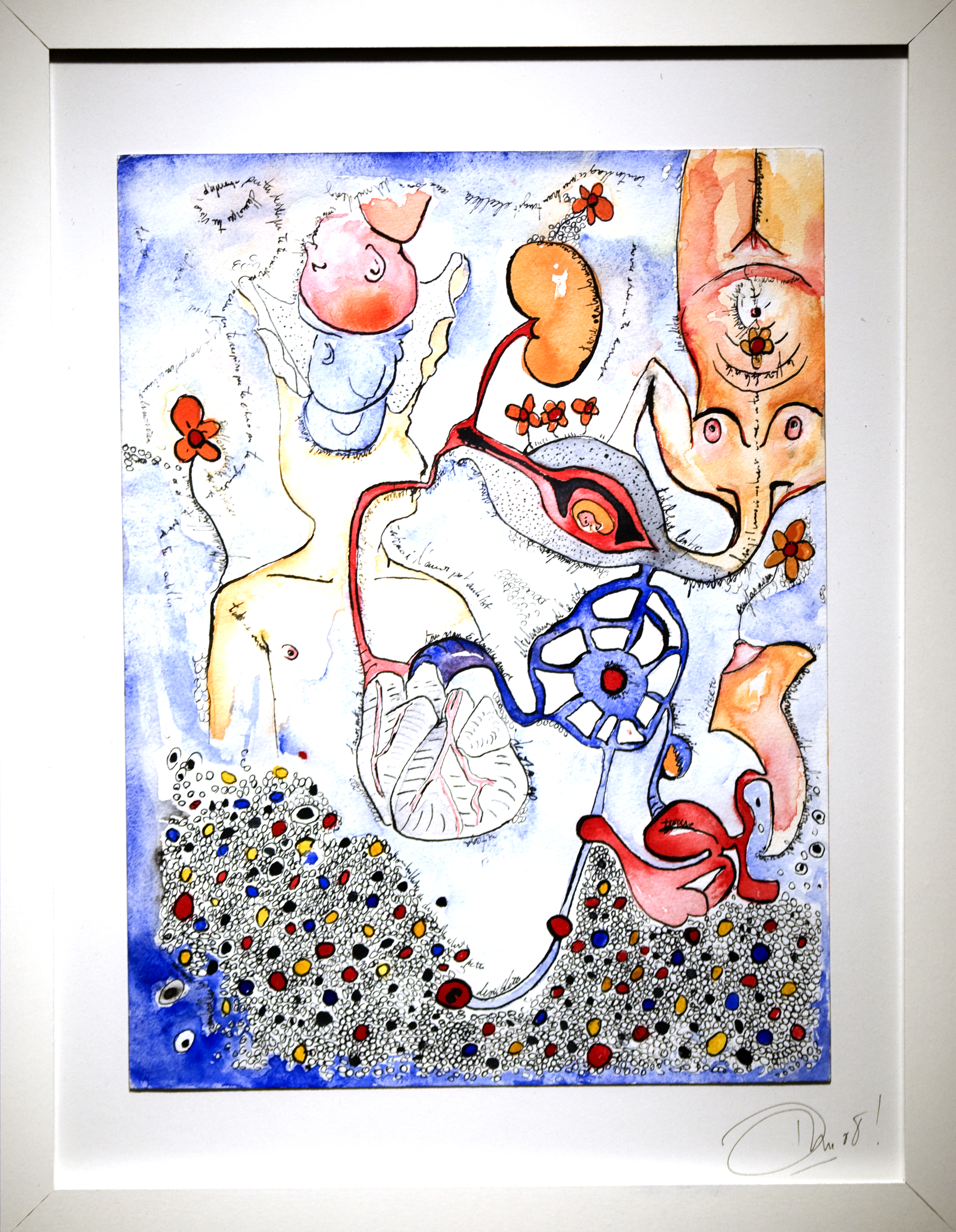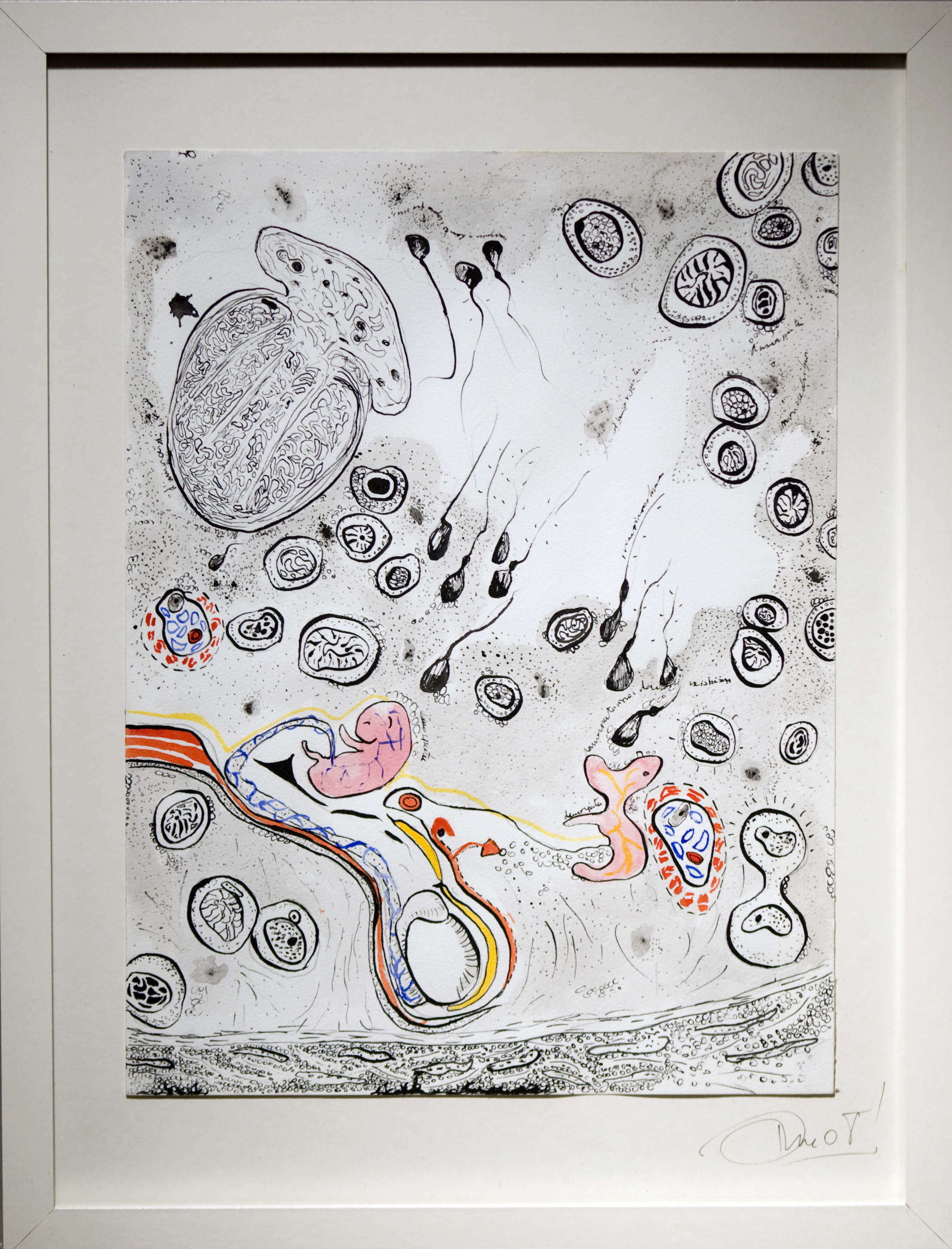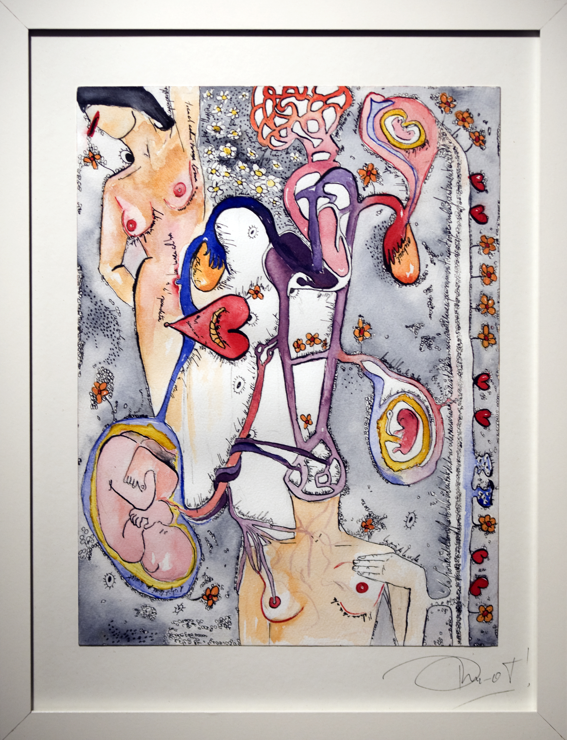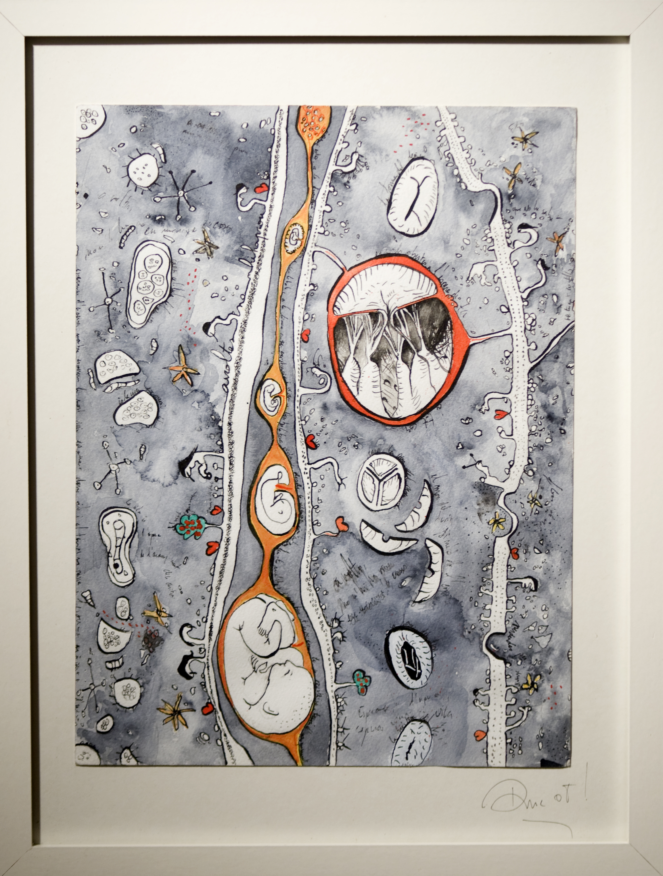 En parallèle à ma formation en arts-plastiques, j’ai fait des études d’infirmière, et lors de ma formation, ce qui m’a le plus fasciné, c’est l’étude anatomique. En 2005, j’ai fait un séjour dans la ville de New-York, j’ai eu l’occasion de visiter l’exposition itinérante: Bodies. Une exposition où le corps humain est décortiqué et montré sans pudeur, un coeur malade d’infarctus, un poumon noir d’un fumeur… et je me suis demandé, comment il serait représenté un coeur malade d’amour? des poumons malade de chagrin? C’est alors, avec l’aide de mes livres d’étude anatomique du corps humain, que j’ai commencé mon projet de Dessins d’une Vie, en 2008.
