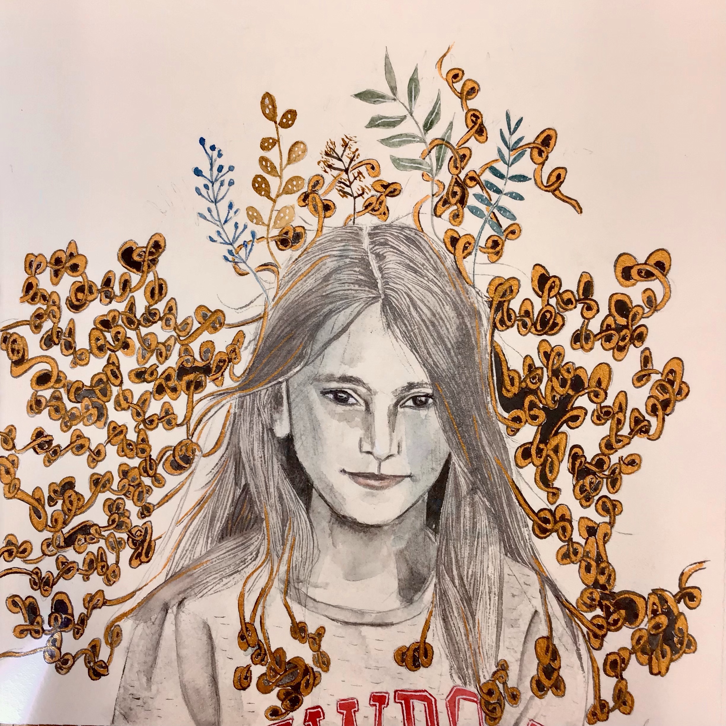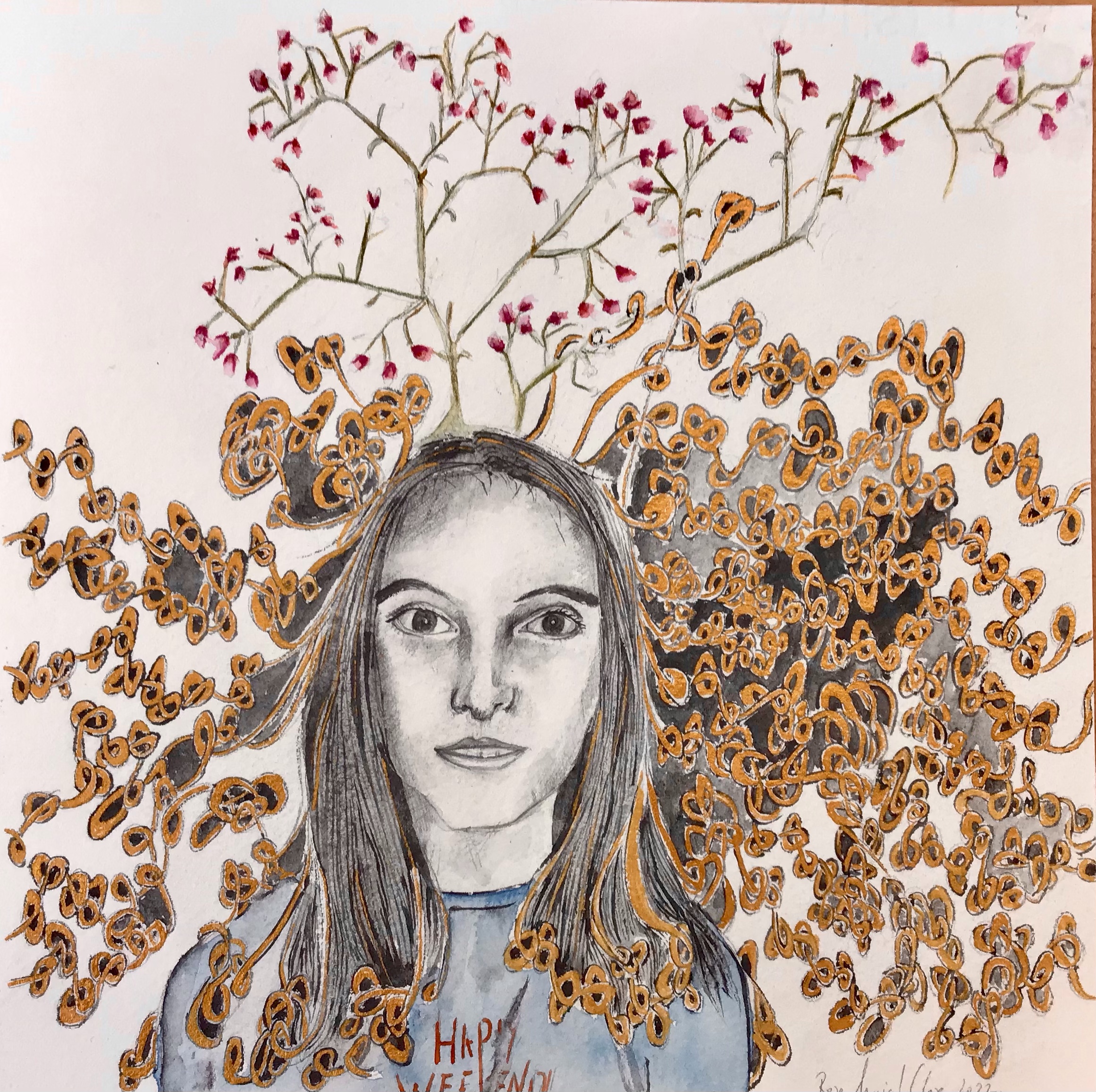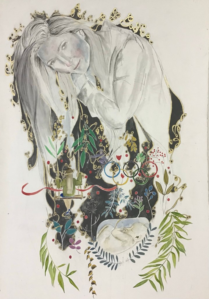 Conceptual portraits made on watercolor graffit and gold leaf on 100% cotton paper 150×90 cm